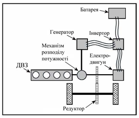 Застосування буферних накопичувачів, але не водню, а електроенергії знімає ці проблеми. Транспортні засоби, обладнані енергоустановками із двома джерелами енергії, один із яких ДВЗ або електрохімічний генератор на основі паливних елементів, а другий буферний накопичувач електроенергії, відповідно до нових виправлень до Правил №83 ЄЕК ООН, зветься "Hybrid Electric Vehicle" (HEV) – АТЗ із КЕУ. Шляхом комбінування енергопотоками двох джерел енергії можна забезпечити зниження витрати палива й викидів шкідливих речовин основного джерела енергії – ДВЗ, що використовує, як традиційне, так і водневе паливо. У випадку застосування замість ДВЗ – електрохімічного генератора в комбінованих енергетичних установках, може бути вирішене ще одне питання – це зменшення вартості енергоустановки за рахунок зменшення потужності електрохімічного генератора, що є найдорожчим, на даний момент часу компонентом. При розгляді автомобілів з КЕУ необхідно мати на увазі не тільки велику різноманітність можливих сполучень різних типів двигунів і джерел енергії з різними видами електрохімічних акумуляторів, але й різноманітну структурну побудову комбінованого живлення із одних і тих же елементів. Розглянемо кілька варіантів комбінованих енергетичних установок на основі застосування ДВЗ. Оскільки в цьому випадку є два джерела механічної енергії (сам ДВЗ й електродвигун), розглядаються дві схеми енергопотоків: послідовна й паралельна. У послідовній схемі відбувається послідовне перетворення механічної енергії в електричну, а електричної знову в механічну. У паралельній схемі, тільки частина механічної енергії перетворюється в електричну, а інша частина механічної енергії передається безпосередньо на колеса. 1.2.1 Послідовна схема Варіанти послідовної схеми наведені на рисунку 1.1. Застосування послідовної схеми комбінованої енергетичної установки дозволяє забезпечити роботу теплового двигуна на тому режимі, що має мінімальні значення витрати палива й викидів шкідливих речовин, причому в ідеальному випадку, можна здійснити повністю стаціонарний режим роботи двигуна. Тяговий електропривід у даній схемі повинен забезпечувати весь діапазон зміни потужності, необхідної для даних умов руху. У послідовній схемі кінематичні зв'язки між ДВЗ і ведучими колесами принципово виключаються. Оскільки при цьому ДВЗ не може передавати момент до ведучих коліс, то, мабуть, потужність, передана в буферний накопичувач, повинна бути не менше, ніж середня потужність, необхідна для руху АТЗ, а потужність й електромагнітний момент тягового електропривода повинні дорівнювати максимальній потужності й максимальному моменту рушіїв. Число провідних осей може бути різним (для звичайних АТЗ це відповідає колісній формулі 4x2 або 4x4), як і навантаження на осі. Для деяких АТЗ (тягачі, магістральні автопоїзди й ін.) перспективні багатовісні схеми з набагато більшим (п'ять і більше) числом осей, причому всі колеса можуть бути ведучими. У таких умовах установка механічних передач між ДВЗ і ведучими колесами затруднена; індивідуальний електропривід спрощує проблему. Можливе використання і в гібридних гусеничних АТЗ.