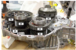автомобіль енергетичний установка паливний 2.1.1 Двигун внутрішнього згоряння Тип 1 NZ-FXE 1,5-літровий двигун Пріус, працює на основі циклу Аткітсона, в якому ступінь стиску може змінюватися. Охолодження водяне. Двигун 4-х тактний, 4-х циліндровий, 16 клапанний, з верхнім розміщення 2-х розподільчих валів, ступінь стиску 13:1. Конструкція двигуна забезпечує низький викид шкідливих речовин з випускними газами. 2.1.2 Механізм розподілу потужності Основні складові ланки в Пріус – це механізм автоматичного розподілу потужності, генератор, електродвигун, інвертор і понижувальні шестерні. Мета механізму розподілу потужності полягає в тому, щоб дозволити передавати потужність від двигуна на генератор і колеса одночасно. Тут потужність передається через планетарну передачу. Водило планетарного механізму з’єднане з валом ДВЗ і потужність від ДВЗ передається на внутрішню сонячну і зовнішню коронну шестерню. Коронна шестерня безпосередньо зв’язана з електродвигуном і передає силу тяги на колеса, сонячна шестерня з’єднана з валом генератора. На рисунках 2.4 і 2.5 зображено схему механізму розподілу потужності окремо і разом з блоком шестерень відповідно. Фотографія фактичного розміщення передачі зображена на рисунку 2.6.