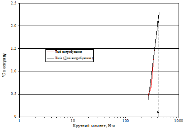 Рисунок 4.19. Швидкість зміни температури обмотки при крутному моменті 400 Н∙м Таблиця 4.13 – ККД і потужності в області максимального крутного моменту