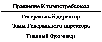 Структура управления предприятием Высшим органом управления Предприятием является правление Крымпотребсоюз, правомочное рассматривать и решать любые вопросы его деятельности. Руководство Предприятием осуществляет Генеральный директор, который назначается на должность правлением Крымпотребсоюза на условиях контракта, где определяются сроки найма, обязанности и ответственность перед правлением, права, условия материального обеспечения и освобождения от должности. По согласованию с правлением Крымпотребсоюза. Генеральный директор КОРТП, имеет право самостоятельно назначать и освобождать от занимаемой должности своих заместителей и главного бухгалтера. А также руководителей и главных бухгалтеров структурных подразделений. Схема изображена на рис.2.
