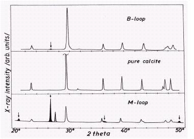 Рисунок 6. Исследование дифракции рентгеновских лучей (Cu излучение) на образцах из обоих контуров: сравнительная картина для образцов из контуров и образцом чистого кальцита. Чтобы объяснить происхождение аморфной фазы и идентифицировать образующее ее вещество мы проводили измерения поглощения в инфракрасной области спектра. Известно, что IR спектроскопия является мощным методом исследования минералов (безводных или гидратированных карбонатов, силикатов, и т.д.) и фаз с низким атомным порядком. Спектры были измерены для нескольких пар образцов. Результат для секции номер 7 (180C) представлен на Рисунке 7. Различия для контуров B и М очевидены, особенно в диапазоне с центром в 1050 cm-1 и в области 3000-4000 cm-1. Анализ спектров проведен в соответствии с [17,18]. Оказалось, что полоса 1050 cm-1 связана с гидрозолями кремнезема и ее интенсивность намного выше для отложений из контура М, то есть для обработанной воды. Поскольку гидрозоли кремнезема обладают сильным сорбционным свойством, в диапазоне 3000-4000 cm-1 должно наблюдаться существенное различие, обусловленное колебаниями молекул воды. Как можно видеть на рисунке 6, именно это фактически и происходит. Здесь отчетливо видна разность концентрации кальцита, что согласуется с результатами химического (Табл.1) и дифракционного анализа (Рис.6), а также измерениями PIXE (Рис.5). Различия концентрации металлов (Fe, Mn, Cu, Zn, ...) приписываются сорбционным свойствам гидрозолей кремнезема. 4 Промышленное применение MWT Магнитная обработка воды была осуществлена на множестве промышленных объектов и, среди прочих, на теплообменниках 1 GW электростанции в Лазиске, Польша. Система охлаждения электростанции работает в наполовину замкнутом цикле, и использует воду из угольной шахты. Дополнительная вода для этой системы (приблизительно 5 % целого объема) подвергается химической обработке (процессы обезуглероживания и коагуляции), в результате получается вода с низкой карбонатной жесткостью, однако с увеличенным и переменным количеством суспензий различного происхождения. Химический метод не помогал решить проблему карбонатных отложений, особенно в течение горячих летних периодов, когда было необходимо чистить систему (главным образом теплообменники, работающие для охлаждения турбины) даже каждые несколько недель. Основываясь на положительных следствиях эксперимента Patnow (см. Рис. 3), было решено дополнить не полностью эффективную химическую обработку магнитным методом. Несколько новых MWT устройств [14] с увеличенной пропускной способностью до 1100 м3/ч и с улучшенной гидродинамикой (См., рис. 2b) были установлены на входе подпитывающей воды. Результаты химического анализа входящей воды следующие: Ca 107.4 мг/л, Mg 46.0 мг/л, Na 134 мг/л, K 17.4 мг/л, Fe 1.5 мг/л, (SO4)2- 354 мг/л (7.38 mval/l), (NO3)- 1.86мг/л (0.03 mval/l), Cl- 96мг/л (2.7 mval/l), SiO2 12.3 мг/л, свободный CO2 22мг/л (1mval/l), pH=8.0, карбонатная жесткость 5.3 mval/l, общая жесткость 9.14 mval/l, общее содержание суспензированных частиц 17.4 мг/л, общее количество твердого остатка 987 мг/л.