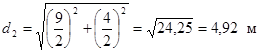 Далее определяем угол между высотой потолка и соответствующим отрезком d: tgα1 = [ d1 / hp] (1.8) tgα1 = [2,5/2,5] = 1 → α1 = 45°; cos3 α1 = (0,707)3 = 0,354; tg α2 = [ d2 / hp ] (1.9) tgα2 = [4,92/2,5] = 1,968 → α2 = 63°; cos3 α2 = (0,454)3 = 0,094; По этому углу находим силу света от каждого источника по таблице 1: I1=84 кд (при α= 45°); I2 = 47,8 кд (при α= 63°). Освещенность помещения относительно контрольной точки от каждого источника: