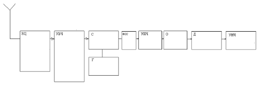 4. Синтез структурной схемы приемникаПри синтезе структурной схемы приемника будем исходить из требований к приемному устройству: · частотная селекция полезных сигналов; · усиление сигналов до уровня необходимого для нормального осуществления их демодуляции; · демодуляция принимаемого сигнала; · подавление помех; селективная система преселектор приемный · схема должна содержать как можно меньшее кол-во перестраиваемых контуров и преобразований частоты. Структурная схема изображена на рис. 1