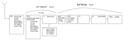 10. Требования предъявляемые к схеме питания приемного устройстваБлок питания приемного устройства должен работать от сети переменного напряжения 220В частоты 50Гц и обеспечивать на выходе постоянное двухполярное напряжение 9В±5%. 11. Структурная схема спроектированного приемного устройстваСтруктурная схема приемника с указанием всех параметров составляющих ее звеньев приведена на рис. 9