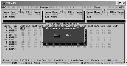 Рисунок 4.2 5. Разработка программного обеспечения комплекса «Обь -128Ц» 5.1 Функции настройки и контроля конвертера ССПС-128 В качестве управляющей используется программа Те r т13.ехе, которая обеспечивает связь ПК и конвертера. Она позволяет установить следующие виды соединений: - с конвертером непосредственно; - с любым конвертером в сети конвертеров; - с конвертером через модем; - с конвертером через модем и сеть конвертеров. Программа позволяет восстановить настройки из файла в память конвертера, сохранить тарификационные буферы (журналы событий). Имеется режим непосредственного управления мониторинга конвертера. Кроме того, имеется возможность обновления программного обеспечения конвертера. Работа в программе Те r т13.ехе организована следующим образом: На экране появляется меню, текущий пункт которого подсвечен. Перемещение по пунктам меню осуществляется клавишами «» - вверх, «» - вниз, Home- в начало меню, End- в конец меню, В строке с названием пункта меню (подменю) указываются «Горячие» клавиши, позволяющие обратиться к данному подменю из произвольных мест программы. Выход в определенный пункт меню осуществляется клавишей «ENTER». Терминал управления предназначен для управления сетью конвертеров. Включает в себя: - персональный компьютер; - программное обеспечение управления, инсталлированное на персональном компьютере; - кабель RS -232 для подключения к конвертеру. Терминал управления выполняет следующие функции: - соединение с любым конвертером сети; - контроль за сетью конвертеров в реальном режиме времени; - сбор и анализ аварийных сообщений; - настройку параметров конвертеров; - загрузку и сохранение конфигураций конвертеров; - удаленное тестирование оборудования конвертеров; - смену программного обеспечения конвертеров сети. Для подключения управляющего терминала необходимо установить соединительный кабель между конвертером и персональным компьютером (ПК) ( рисунок 5.1) Включить питание конвертера, при этом должен светиться светодиод «РАБОЧИЙ РЕЖИМ». Для запуска управляющей программы Term 13 необходимо в режиме DOS добавить в файл config . sys одну строку: devise =с:\ itsd \т drv .ехе т icdev 0 x 3 f 8 4 115200, при этом в рабочей директории ПК должны находиться файлы: - mdrv. ехе ; - term7. ехе ; - то nitor. ехе. Желательно, чтобы СОМ-порт ПК был совместим с UART-16550. [4] Для установления соединения необходимо в режиме DOS запустить программу Те r т13.ехе. При этом на экране монитора должно появиться окно «Главное Меню», представленное (рисунок 5.2), а светодиод «ОБМЕН RS-232» должен мигать. Из окна «структура процессов» доступ к функциям управления конвертора возможен через «главное меню» (клавиша [F10]) или «горячие клавиши». Назначение пунктов меню: - Терминал - вызов режима взаимодействия с встроенным монитором конвертера; - Тарификация - вызов меню управления тарификационными буферами; - Настройки - вызов меню управления настройками; - Драйвер устройства - задается имя устройства (драйвер коммуникационного порта через который будет установлена связь с конвертером); - DОS - вызов команды или исполняемого файла DОS без выхода из программы (с возвратом); - Стандартный терминал - режим «Обычного» терминала. При установленном соединении должны появляться цифры 9 с периодом около 2 сек. При соединении через модем набрать Аtdpnnnnnnn, где nnnnnnn-телефонный номер удаленного модема;