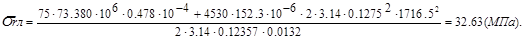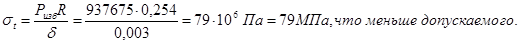Замок лопатки удовлетворяет нормам прочности на смятие, полученное значение Расчет на прочность корпусов камеры сгорания Способ расчета на прочность зависит от конструкции камеры. Напряжения, вызывающие поломку, во многих случаях происходит от частых изменений режима работы двигателя, при которых происходит резкий перепад температур. Анализ поломок показывает, что часть из них происходит из-за температурных напряжений в материале. Камера сгорания рассчитывается на прочность и устойчивость на максимальном режиме работы двигателя при полете у земли в зимних условиях. Расчет на прочность наружного корпуса Под влиянием внутреннего давления воздуха стенки наружного корпуса испытывают напряжения растяжения. Расчет производится в предположении, что разрыв происходит по образующей. В целях упрощения расчета допускается представлять наружный корпус в виде цилиндрической оболочки, с диаметром, равным среднему диаметру реального корпуса. Исходные данные: Радиус оболочки R=254 мм, Толщина оболочки d=3 мм, Давление снаружи Рн=101325 Па, Давление внутри Рвн=1039000 Па,