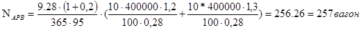 где Р – процент груза от общего грузопотока; Gi – годовой грузопоток, тыс.т; V – погрузочный объем вагона, м3 ; g - погрузочный вес груза, т/м3 . В качестве примера приведем расчет для свежих овощей: P = 10%; VАРВ = 88 м3 ; g = 0,28 т/м3 , грузоподъемность АРВ– 40 т.