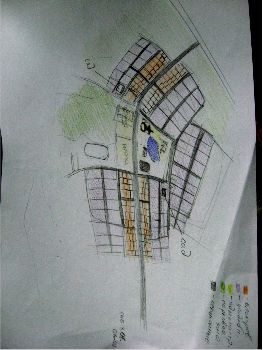 4. Идея-концепцияПри выборе мест для застройки я пользовался анализом рельефа и размещал жилищную зону в наиболее благоприятной части. Я решил провести сквозную главную улицу через середину посёлка и вынес на её характерные блокированные здания, секционные дома, здания общественного пользования и церковь. Церковь расположена при помощи эффекта направления взгляда зрителя на характерную точку. Так как церковь в нашем посёлке является одной из доминант то наша главная дорога идущая от магистрали не меняет своего направления до церкви, так мы добиваемся направления,, гостей” нашего посёлка в общественный центр, от куда собственно и можно попасть в нужную часть посёлка по дорогам, расположенным наиболее функционально на мой взгляд. Парк я решил вывести к реке, чтобы люди гуляющие по нему могли насладится не только различными породами деревьев, но и прогуляться по берегу. Я решил слегка уйти от строгой формы посёлка, но есть две стороны медали нашего задания. Можно задать любую форму нашему посёлку но вопрос стоит скорее не форме посёлка а в том как всё функционально расположено. Вид со спутника как показывает практика не даёт никакого эстетического наслаждения от созерцания форм городов и посёлков. Разработанный эскиз поселка: