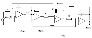 Таким образом (функционально-топологические правила табл. 2), решение задачи сводится к подключению дополнительного масштабного усилителя-сумматора между инвертирующим входом ОУ и дополнительным входом схемы, которое позволяет реализовать на выходе основного активного элемента передаточную функцию звена полосового типа. При этом, как видно из (82), в силу отсутствия сдвига между частотой полюса звена и собственной частотой пассивной цепи в конечной реализации при соответствующем выборе