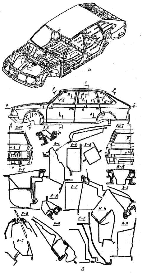 Рис. 2.1.1. Корпус кузова легковой КМ: а – общий вид; б – основные сечения Тоннель для размещения коробки передач и выхлопной системы, который выполнен как выштамповка пола, несколько смещен вправо, что обусловливает несимметричность кузова относительно продольной оси. Топливный бак и глушитель размещены под задним сиденьем, что позволяет решить проблему пожаробезопасности, уменьшить вибрации от элементов выхлопной системы. Форма пола и арок задних колес определяется максимальными перемещениями последних с учетом поперечного сдвига, возможного при одностороннем ходе подвески. Для улучшения технологического процесса сборки КМ двигатель, переднюю независимую подвеску (обычно типа Макферсон) с упругими элементами, передний мост и коробку передач можно агрегатировать как один сборочный узел, монтируемый на поперечной балке корытообразного вида с помощью специальных упругих опор. Поперечину силового агрегата болтовым соединением с помощью упругих элементов крепят к передним лонжеронам, заднюю опору - к кронштейну в районе тоннеля, а амортизационную стойку с упругим элементом - к чашкам переднего брызговика. В этом случае нагрузки от подвески на кузов передаются непосредственно через систему "лонжерон - передний брызговик - балка верхнего пояса передней части кузова". Лонжерон коробчатого сечения, имеющий изогнутую форму в продольной плоскости, обладает достаточной жесткостью и является деформируемым элементом, воспринимающим энергию фронтального удара при столкновении. Форма брызговика должна способствовать хорошему омыванию потоком холодного воздуха двигательного отсека и обеспечивать удобный монтаж и демонтаж агрегатов. Передний щит служит разделительной перегородкой между салоном и отсеком двигателя, а также является важнейшим поперечным элементом каркаса салона, в значительной степени определяющим его жесткость при кручении. В нижней части, где осуществляется присоединение силового агрегата, щит имеет усиление, а в средней части щита выполнен проем, необходимый для установки системы кондиционирования и отопления. Усиления в виде короба также выполнены в местах крепления элементов рулевого механизма. Боковины изготавливают из трех отдельных штампованных деталей: наружной, простирающейся от передней стойки до задней части КМ (по всей длине), включая проемы дверей и боковых окон, внутренней и усилителя. При этом размеры детали должны быть очень точными, что позволяет облегчить подгонку и размещение дверей. Крышу с задним оконным проемом изготавливают из одного цельного листа металла, в этом случае проем получается достаточно точным. Передний щит и задняя панель кузова, крыша, боковины и пол образуют салон КМ, который собирают в главном кондукторе после того, как предварительно подсобраны внутренние панели боковин и внутренняя рама крыши. Передние крылья в целях упрощения их замены при повреждениях можно выполнять съемными. Задние крылья для получения требуемой жесткости присоединены к кузову с помощью сварки, в результате чего крылья являются частью боковины. Кузов автомобиля ВАЗ 2108(09) — цельнометаллический, сварной, несущей конструкции (рис. 2.1.1.). Элементы кузова соединены между собой контактной сваркой, а в труднодоступных местах — электросваркой (полуавтоматом в среде инертного газа). Стыки 