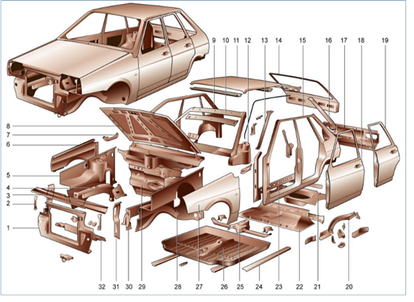 Рис. 2.1.2. Детали каркаса кузова: 1 – панель рамки радиатора; 2 – кронштейн крепления блок-фары; 3 – верхняя поперечина рамки радиатора; 4 правый передний лонжерон; 5 – правый брызговик переднего крыла; 6 – правое переднее крыло; 7 – соединитель рамы ветрового окна и боковины; 8 капот; 9 – правая наружная панель боковины; 10 – рама ветрового окна; 11 – панель крыши; 12 – арка заднего колеса; 13 – внутренняя стойка рамы ветрового окна; 14 – дверь задка; 15 – левая наружная панель боковины; 16 – желобок проема двери задка; 17 – панель задка; 18 – передняя дверь; 19 – задняя дверь; 20 – задний лонжерон пола; 21 задний пол; 22 – средний пол; 23 – нижняя накладка боковины; 24 – усилитель пола под установку домкрата; 25 – передняя поперечина пола; 26 – передний пол; 27 – левое переднее крыло; 28 – левый брызговик переднего крыла; 29 – щиток передка; 30 – левый передний лонжерон; 31 – стойка рамки радиатора; 32 – нижняя поперечина рамки радиатора