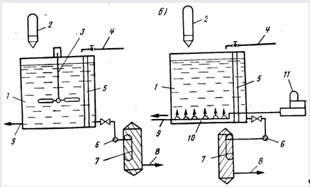 Рис. 16.2. Фтораторная установка с растворным баком с механическим побуждением (а) и с барбатированнем (б). 1 — растворный бак; 2 — бункер с дозирующим устройством; 3 — механическая мешалка; 4 — подача воды; 5 — поплавковое устройство; 6 — насос; 7 — напорный фильтр для осветления раствора фторсодержа- Щего реагента; 8 — фторпровод; 9 — сброс осадка; 10 — воздухораспределительная система; И — воздуходувка Во фтораторных установках с затворно-растворными баками в качестве реагента принят фтористый натрий с расходом в сутки 20 кг. Установка состоит из системы баков: затворного — объемом 400 л, двух растворных — объемом 1500 л каждый, дозирующего бачка, снабженного поплавковым клапаном. Затворный и растворные баки оборудованы электромешалками. Растворяют фтористый натрий в воде, нагретой до 75...80°С, для чего в затворный бак вмонтирован электронагреватель. Крепкий раствор переливают в расходный бак, предварительно на 1/3 наполненный водой, бак дополняют водой до нужной отметки и раствор тщательно перемешивают. После определения содержания фтора в растворе последний через вентиль подают в дозирующий бак и затем в резервуар чистой воды. Фтораторные установки с применением 8%-ной кремнефто- ристоводородной кислоты показаны на рис. 16.3.