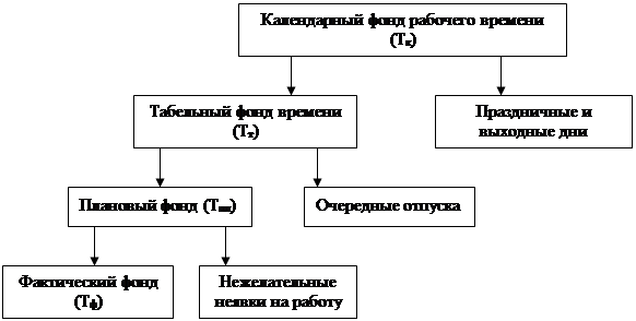 TPTi – тарифный разряд работ i-ого вида, VPTi – объем работ i-ого вида. Средний тарифный разряд рабочих должен быть равен среднему тарифному разряду работ. Если средний тарифный разряд рабочих больше среднего тарифного разряда работ, то это говорит о нерациональности размещения рабочей силы. Если наоборот, то это может привести к выпуску некачественной продукции. Далее анализируется движение рабочей силы по предприятию в целом, отдельным структурным подразделениям, категориям и профессиям. Для этого рассчитываются следующие коэффициенты: 1) коэффициент оборота по приему= 2) коэффициент оборота по выбытию= 3) коэффициент текучести кадров= = 4) коэффициент постоянства персонала = = 5) коэффициент общего оборота= Показатели анализируются в динамике, по итогам анализа делаются выводы по поводу их изменения. 1.2 Содержание анализа использования трудовых ресурсов Анализ использования трудовых ресурсов включает в себя: · Анализ использования рабочего времени, · Анализ производительности труда, · Анализ трудоемкости продукции, · Анализ фонда заработной платы (ФЗП). Анализ использования рабочего времени проводится по предприятию в целом, отдельным структурным подразделениям и категориям работников и основан на балансе рабочего времени (схема 1). Схема 1. Фонд рабочего времени.