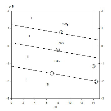 Как ранее упоминалось, на полные диаграммы рН-потенциал наносят семейства линий при активностях ионов в растворе равных 100 , 10-2 , 10-4 , 10-6 моль, соответственно обозначаемые 0, - 2, - 4, - 6. Для характеристики коррозионных процессов можно использовать упрощенные диаграммы рН-потенциал. Для этого или объединяют отдельные кривые, соответствующие различным активностям (проводят усредненную кривую), в одну, либо строят диаграмму только для одной из активностей ионов в растворе. Диаграмма рН-потенциал системы Si-H2 O и Ni-O Диаграмма электрохимического равновесия системы Si-H2 O представлена на рис.1.5 [7].
