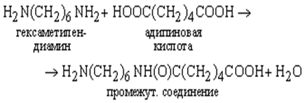Реакция на этом не заканчивается, поскольку образующиеся промежуточные соединения также бифункциональны и могут реагировать с мономерами или друг с другом. Конечным результатом являются длинные линейные цепи повторяющихся звеньев –HN(CH2 )6 NH(O)C(CH2 )4 CO–. Схема реакции показана ниже. Полимеры такого типа называют полиамидами, поскольку они содержат много амидных групп C(O)–NH; они более известны под общим названием найлоны.
