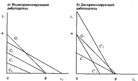 Рис. 8.1. Дискриминирующая монопсония Из условия максимизации прибыли следует, что ¶p / ¶L 1 = ¶p / ¶L 2 = 0 иP ¶Q / ¶L 1 = P ¶Q / ¶L 2 . ТогдаW 1 (1 + 1/eS 1 ) = W 2 (l + 1/eS 2 ), где eS 1 — эластичность предложения труда первой группы работников; eS 2 — эластичность предложения труда второй группы работников. Так как по условиям возможности дискриминации eS 1 > eS 2 , то W 1 > W 2 . 3. Модели склонности к дискриминации Модель склонности к дискриминации (модель дискриминации Беккера) предполагает, что работодатель может иметь склонность к дискриминации каких-либо групп работников. В модели предполагается, что работники дискриминируемой и недискриминируемой групп имеют одинаковую производительность и совершенно заменяемы в производстве. На рис. 8.2а Q 1 показывает изокванту фирмы, которая будет прямой линией при принятых предпосылках, а 0A = 0B . Если заработная плата работников недискриминируемой группы — W 1 , а заработная плата работников дискриминируемой группы — W 2 , W 1 > W 2 , то С 0 , С 1 , С 2 — изокосты, имеющие наклон (-W 2 /W 1 ). Недискриминирующая фирма максимизирует свою прибыль при выпуске Q 1 в точке В , нанимая только работников из дискриминируемой группы, так как их заработная плата меньше и издержки в этом случае минимальны. На рис. 8.2б показаны те же изокванта Q 1 и изокоста C 1 . В данном случае работодатель склонен к дискриминации. Он несет дополнительные помимо заработной платы издержки при найме дискриминируемых работников. Эти издержки могут быть связаны с дискриминацией со стороны как работников (конфликты в коллективе), так и потребителей производимых благ (потеря части рынка) или непосредственно с отношением работодателя к дискриминируемым работникам. Общие издержки от найма работников дискриминируемой группы составят W 2 (1 + d ), где d (d >0) — это коэффициент дискриминации, который показывает, насколько по отношению к издержкам на заработную плату возрастают издержки работодателя при найме дискриминируемых работников. С учетом дополнительных издержек при найме дискриминируемых работников новые линии изокост будут С ’’1 , С ’’2 с наклоном (-W 2 (1 + d ) / W 1 ). дискриминация монопсонистический оплата труд ценность