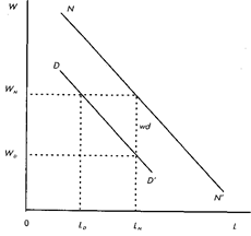 Рис. 8.4. Занятость и заработная плата дискриминирумой группы предельного денежного продукта труда обеих групп в отсутствие дискриминации (эта же кривая соответственно является и кривой спроса на труд). В условиях дискриминации кривая спроса на труд дискриминируемой группы DD ’ сдвинется влево на величину, равную wd , определяемую коэффициентом дискриминации. Если рассматривать сдвиг кривой как вертикальный сдвиг, то это означает, что дискриминирующий работодатель готов нанять одинаковое количество (LN ) работников дискриминируемой и недискриминируемой группы, только если ставка заработной платы работников дискриминируемой группы равна WD . Если же рассматривать сдвиг кривой как сдвиг по горизонтали, то это означает, что работодатель готов при равной ставке заработной платы WN для обеих групп работников нанять только LD работников дискриминируемой группы. Один из главных выводов из модели склонности к дискриминации заключается в том, что дискриминирующий работодатель будет нести дополнительные издержки и в условиях совершенной конкуренции в долгосрочном периоде будет вытесняться с рынка недискриминирующими работодателями. До того же, как это произойдет, дискриминация на рынке труда будет сохраняться и выражаться в меньшей заработной плате работников дискриминируемой группы. Рынок труда при наличии работодателей, склонных к дискриминации, представлен на рис. 8.5. По вертикальной оси расположено отношение заработной платы дискриминируемых работников к заработной плате