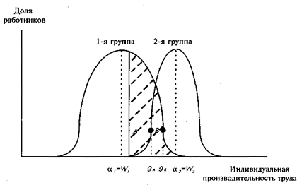 Рис. 8.6. Влияние изменения степени и масштабов дискриминации на относительную заработную плату недискриминируемых работников WR , по горизонтальной — доля работников дискриминируемой группы в составе рабочей силы LR . Кривая относительного спроса на труд DLR будет ломаной: горизонтальный участок будет соответствовать той части работодателей, которые не склонны к дискриминации, а понижающийся участок кривой спроса на труд — части работодателей, склонных к дискриминации, упорядоченным по возрастанию коэффициента дискриминации. Общая занятость LR ’ и заработная плата WR ’ работников дискриминируемой группы будет определяться пересечением кривых спроса DLR и предложения их труда SLR . Чем меньше доля работников дискриминируемой группы в составе рабочей силы, тем меньше будет дифференциация заработной платы. Если относительное предложение труда работников будет невелико и сдвинется, как это показано на рис. 8.5 до SLR 1 , то различий в оплате труда между дискриминируемыми и недискриминируемыми работниками не будет, все работники дискриминируемой группы найдут рабочие места у работодателей, не склонных к дискриминации. На изменение дискриминационных различий в заработной плате будут оказывать влияние изменения не только в предложении труда, но и в спросе на труд. В случае, когда количество недискриминирующих работодателей возрастет, кривая спроса на труд сдвинется вправо до DLR 1 и увеличится горизонтальный отрезок кривой относительного спроса на труд. Это приведет к увеличению занятости работников дискриминируемой группы до LR 1 и уменьшению дискриминационных различий в заработной плате до WR 1 . Эта ситуация представлена на рис. 8.6а. Аналогичные изменения вызовет и уменьшение склонности к дискриминации, сокращение коэффициента дискриминации. На рис. 8.6б показана ситуация, когда у всех работодателей, склонных к дискриминации, коэффициент дискриминации пропорционально уменьшится. Графически это отображено меньшим наклоном нисходящего отрезка кривой относительного спроса на труд. В этом случае занятость работников дискриминируемой группы возрастет до LR 2 , а дискриминационные различия в заработной плате уменьшатся до WR 2 . 4. Статистическая дискриминацияСтатистическая дискриминация — это дискриминация работников в случае решений, принимаемых работодателем на основе средних характеристик, присущих группе, к которой принадлежит данный работник. Теория статистической дискриминации исходит из того, что: существует несовершенство информации; работники делятся на группы по своей производительности; издержки на индивидуальный отбор работников, на выяснение их производительности высоки; работодателю известны усредненные данные о производительности в каждой группе; существуют видимые, не требующие издержек для их выяснения характеристики (пол, возраст, национальность и т. д.), свидетельствующие о принадлежности работников к той или иной группе. Тогда при отборе работника работодатель, ориентируясь на видимые характеристики работника, будет делать вывод о его производительности и устанавливать заработную плату, соответствующую средней для данной группы. В результате может возникнуть ситуация (рис. 8.7), когда работник В из первой группы имеет индивидуальную производительность gB , работник А из второй группы — индивидуал