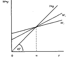 Рис. 8.7. Статистическая дискриминация Статистическая дискриминация может также возникать, даже если для отбора, помимо видимых характеристик, применяются специальные методы — тесты, результаты которых Y позволяют с некоторой вероятностью bсудить об индивидуальной производительности работника gi . Если тесты абсолютно достоверно отражают производительность каждого работника (b = 1), то работодатель при установлении заработной платы полагается только на тест, а не на среднюю производительность группы. В этом случае Wi = gi = Yi (рис. 8.8а), информация совершенна и дискриминация отсутствует, так как каждый работник оплачивается в соответствии с его индивидуальной производительностью. Когда достоверность теста не абсолютна, 0 < b <1, установление индивидуальной производительности и заработной платы происходит на основании и представлений о средней производительности в группе а, и теста Yi так, что:Wi = E (gi ) = (1-b) a + bYi . Если степень достоверности теста одинакова для обеих групп (b1 = b2 ), а средняя производительность в группах различна (a2 >a1 ), то складывается следующая ситуация (рис. 8.8б):