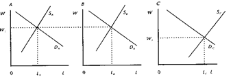 Рис. 8.8. Статистическая дискриминация при применении тестов на производительность W 1 = a1 (l-b) + bY 1 , W 2 = a2 (l-b) + bY 2 . В результате возникают различия в заработной плате для работников с одинаковой производительностью (в той мере, в какой их заработная плата определяется по характеристикам производительности группы, к которой они принадлежат), т. е. существует индивидуальная дискриминация. Если достоверность теста неодинакова для разных групп работников, например, тест более достоверно отражает производительность работников группы 2, b2 > b1 , а средняя производительность в группах одинакова (a1 = a2 = a), то складывается ситуация, изображенная на рис. 8.8в. Чем более достоверен тест, тем в большей степени им определяется уровень производительности и оплаты труда работника. Чем менее достоверен тест, тем в большей степени уровень производительности и оплаты труда работника определяется средней производительностью. Разница в оплате работников с одинаковой производительностью из разных групп будет: W 2 — W 1 = = (Y — a)( b2 — b1 ). Тогда при результате теста Yi > a работники группы 2 будут иметь более высокий уровень заработной платы, чем работники группы 1, а если результат теста Yi < a, то работники группы 2 будут иметь заработную плату ниже, чем работники группы 1. Групповой дискриминации нет, но индивидуальная сохраняется, так как каждому члену группы 1, которому недоплачивают, соответствует член этой же группы, которому переплачивают, такая же ситуация в группе 2. 5. Дискриминация и сегрегация В результате существования дискриминационных барьеров для мобильности рабочей силы возникает сегрегация на рынке труда. Сегрегация — это разделение работников на группы и ограничение доступа каких-либо групп работников к части рабочих мест (непосредственно или через ограничение доступа к профессиональной подготовке). Сегрегация — это одна из форм дискриминации на рынке труда. Обычно рассматривают отраслевую сегрегацию (неравномерное распределение групп работников по отраслям) или профессиональную сегрегацию (неравномерное распределение групп работников по профессиям). Последствия такой формы дискриминации описывает модель профессиональной сегрегации, или модель «столпотворения». В основе ее лежат следующие предпосылки: на рынке труда существуют две группы работников, одинаковые по своей производительности и рабочим характеристикам; для дискриминируемой группы работников часть рабочих мест является недоступной, межпрофессиональная мобильность для этой группы ограничена. Рассмотрим эту модель на примере конкурентного рынка труда, состоящего из трех профессий А , В , С (рис. 8.9). Предположим, что спрос на труд одинаков по своим характеристикам для всех трех профессий. Рабочая сила распределена поровну между работниками дискриминируемой и недискриминируемой групп, но для дискриминируемой группы доступна только профессия С . Тогда работники недискриминируемой группы распределяются равномерно по профессиям А и В так, что LA = LB , а ставка заработной платы — W 1 . С другой стороны, работники дискриминируемой группы все сосредоточатся в профессии С, при этом так как LC = LA + LB , то равновесие достигается при меньшей заработной плате, равной W 2 . Работники дискриминируемой группы из-запрофессиональной сегрегациине могут