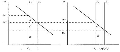 = где М i — процентная доля профессии i среди всех занятых группы M ; Fi — процентная доля профессии i среди всех занятых группы F . Индекс показывает, какой процент членов каждой из двух сравниваемых групп (он одинаков для каждой группы, так как перемещения между профессиями симметричны для обеих групп, поэтому в знаменателе формулы стоит 2) должен сменить место работы для устранения сегрегации. Если индекс равен 1, то профессии или отрасли полностью разделены по двум группам, если — 0, то каждая из групп равномерно представлена во всех профессиях или отраслях. 6. Издержки от дискриминации Дискриминация выражается в необоснованных различиях в заработной плате или в занятости. Для того, чтобы проанализировать издержки от дискриминации, рассмотрим простую модель. Предположим, что есть две одинаковые по производственным характеристикам группы работников, 1 и 2, и есть две одинаковые отрасли. Каждая группа работников используется только в своей отрасли. Предположим также, что спрос на факторы одинаков и совершенно неэластичен (рис. 8.10). При условии конкуренции и предполагая, что нет ни издержек подстройки рынка, ни неденежных различий между двумя отраслями, установится одинаковая для обеих отраслей заработная плата W *. Если в первой отрасли будет установлена заработная плата W 1 с учетом разницы (W 1 — W *), W 1 > W *, или если занятость в этой отрасли будет искусственно сдерживаться на уровне L ’1 , то вытесненные из первой отрасли работники группы 1 будут искать рабочие места во второй отрасли. Это понизит заработную плату во второй отрасли до W 2 , W 1 < W *. Рынок теперь характеризуется разницей в заработной плате, недискриминируемые работники из группы 1 выигрывают, дискриминируемые работники из группы 2 проигрывают в заработной плате, и существует частичная сегрегация. Эти предпосылки в том или ином виде используются во всех теориях дискриминации. Дискриминация приносит выгоду одним членам общества и вред другим. Но при этом, если выигрыш первых недостаточен для того, чтобы компенсировать потери вторых, то дискриминирующая экономика движется от потенциально Парето-эффективной ситуации в обратную сторону. На рис. 8.10 в результате сокращения занятости в отрасли 1 произойдет сокращение