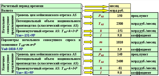 Рисунок 2.5 –График совокупного спроса и конечного совокупного предложения Таблица 2.3 –Влияние изменения совокупного предложения на параметры национальной экономики