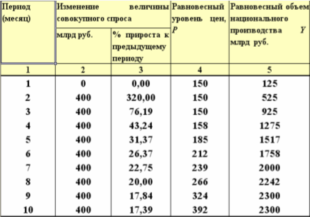 Графа 2:%∆Pi =(Pi-Pi-1 )*100/ Pi-1 =(158-150)*100/150=5,64 (Pi-равновесный уровень цен (графа 4 таблицы 2.1)) Графа 3:%∆Pi =(Pi-Po )*100/ Po =(158-150)*100/150=5,64 (Po –равновесный уровень цен (графа 4 таблицы 2.1)) Графа 4:%∆Yi =(Yi-Yi -1 )=(1275-925)=350 (Y-равновесный объем национального производства (графа 5 таблицы 2.1)) Графа 5:%∆Yi =(Yi-Yi -1 )*100/ Yi -1 =(1275-925)*100/925=37,85 Графа 6:%∆Yi =(Yi-Yo )*100/ Yo =(1275-125)*100/125=920,09 (Yo - равновесный объем национального производства (графа 5 таблицы 2.1)) Графа 7: Эi =∆YADi -∆Yi =400-350=50 (∆YAD –изменение величины совокупного спроса (графа 2 таблицы 2.1))