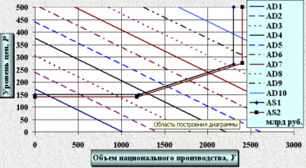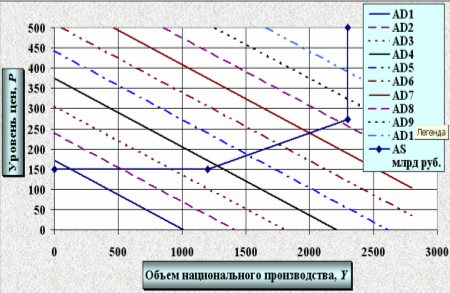 Рисунок 2.1 -График совокупного спроса и начального совокупного предложения 2.2 Задание «Анализ изменений макропоказателей при увеличении совокупного спроса» Таблица 2.2-Динамика показателей национальной экономики при изменении совокупного спроса (начальное совокупное предложение)