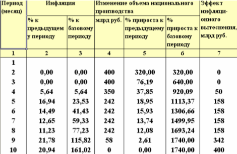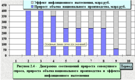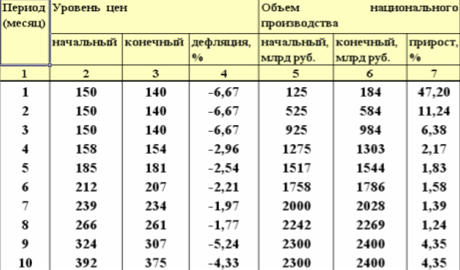 Рисунок 2.4 –Диаграмма соотношений прироста совокупного спроса, прироста объема национального производства и эффекта и эффекта инфляционного вытеснения (млрд. руб.) Выводы: а) скачкообразный характер изменения текущей информации по периодам можно объяснить поведением цен на разных отрезках кривой. На промежуточном отрезке наблюдается плавное возрастание цен, а на классическом наблюдается резкий скачок. б) убывающий характер текущей динамики объемов национального производства объясняется тем, что равновесный объем национального производства увеличивается в каждом месяце, а величина изменения объема национального производства к предыдущему периоду этот показатель уменьшается. в) возрастающий характер (с нулевой зоной) накопленной инфляции объясняется тем, что этот показатель рассчитывается к базовому периоду, а равновесный уровень цен увеличивается в каждом периоде. Поэтому накопленная инфляция будет возрастать. г) Г-образный характер накопленной динамики объемов национального производства объясняется тем, что на кейнсианском и промежуточном отрезках кривой совокупного предложения объем национального производства увеличивается, а на классическом не изменяется. д) усиление эффекта инфляционного вытеснения объясняется постоянным увеличением совокупного спроса и убыванием текущей динамики объемов национального производства. 2.3 Задание «Прогноз основных макропоказателей при росте совокупного предложения»