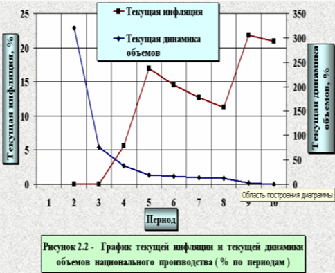 Рисунок 2.2 –График текущей инфляции и текущей динамики объемов национального производства (% по периодам)