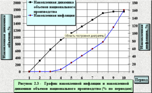 Рисунок 2.3 –График накопленной инфляции и накопленной динамики объемов национального производства (% по периодам)