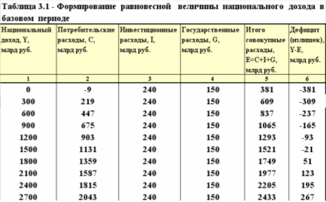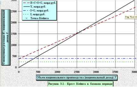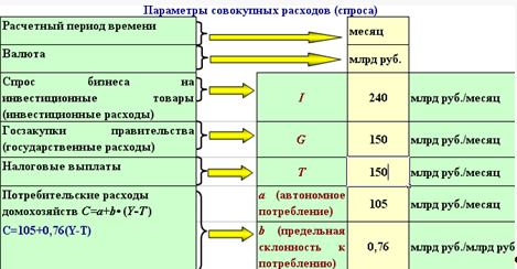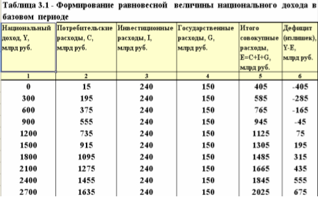 3.1 Механизм формирования равновесной величины национального дохода в модели Кейнса 3.1.1 Бизнес ежемесячно делает закупки инвестиционных товаров (инвестиционные расходы I) на сумму 240 млрд. руб. Правительство ежемесячно делает госзакупки (госрасходы) на сумму 150 млрд. руб. Домохозяйства ежемесячно при разных доходах и налогах тратят на потребительские товары и услуги сумму: C=a+b(Y-T), где Y – доход (национальный доход), млрд. руб./мес. T – выплачиваемые налоги, млрд.руб./мес. b – предельная склонность к потреблению (b=0,76 руб./руб.) a – автономное потребление (a=105 млрд.руб./мес.) Налоговые выплаты (T) в базовом (первом) периоде (месяце) равны государственным расходам (G) (T=G). Рассчитать основные макропоказатели для 10 вариантов национального дохода с шагом 300 млрд.руб. Один из вариантов должен быть равновесным. Построить крест Кейнса.