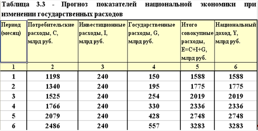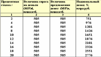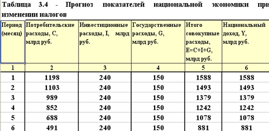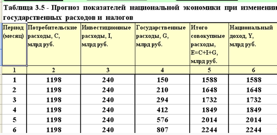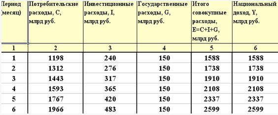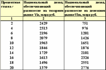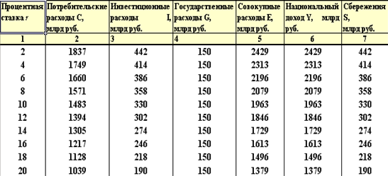 Графа 1: ri = ri -1 + 2, r0 = 2, Графа 3: Ii = с-d*ri , Графа 4: Gi = G0 . Графа 6: Национальный доход Y определяется по формуле YIS