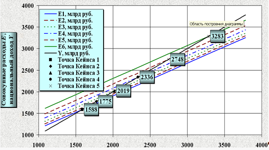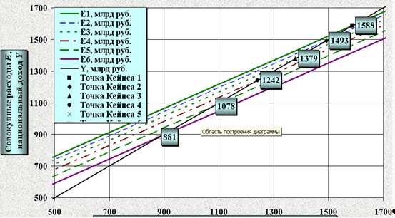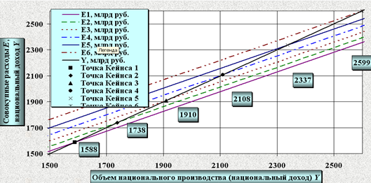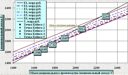 Пример расчёта 2-ой строки Ti=Ti-1•1,4ÞT=150*1.4=210 Графа 3: I = 240 Графа 4: G= Gi=Gi-1•1,4ÞG=150*1.4=210 Графа 6: E=Y, Y=(a+I+G–b*T)/(1-b)=(105+240+210-0,76*210)/0,24=1648 Графа 2: C=a+b•(Y-T)=105+0,76(1648-210)=1198 Графа 5: E=C+I+G = 1198+240+150 = 1648 Построение графика аналогично п. 3.2.1. 1точка — равновесная. Для расчета 2-ой используем формулу Ei=a+b*(Yi –Ti) +Ii +Gi . 1период — (1648;1648), и при Y = 0 ÞE = 105 – 0,76*150+240+150 = 381, (0;381) 2период — (1732;1732), и при Y = 0 ÞE = 105-0,76*210+240+210 = 446 (0;396). 3 — (1849;1849) и (0;416); 4—(2014;2014) и (0;444); 5 — (2244;2244) и (0;483).