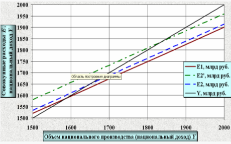 3.5.2 Проверить теорему Хаавельмо о единичном мультипликаторе сбалансированного госбюджета На кресте Кейнса строится 3 графика совокупных расходов. E1 для 1 периода, E2 — 2 периода, E2’ — для промежуточного, с увеличенными госрасходами G2 и базовыми налогами Т1. E1=a+b*(Y–T1) +I +G1 E2’=a+b*(Y –T1) +Ii +G2 E2=a+b*(Y –T2) +I +G2 T1 = 150, G1 = 150 T2 = G2 = 150*1,4 = 210. Для расчета Y используем формулу Кейнса: Y=(a+I+G–b*T)/(1-b). Равновесные точки: Y1 = (105+240+150-0,76*150)/0,24=1587; Е1 =1587 Y2’ = (105+240+210-0,76*150)/0,24=1838 ; E2’ = 1838 Y2 = (105+240+210-0,76*210)/0,24 =1646 ; E2 = 1646 Для второй точки Y=0, получаем еще 3 точки (в таблице).