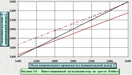 3.5.3 Проверить теорему Хаавельмо о единичном мультипликаторе сбалансированного госбюджета. Y1=(a+I+G1–b*T1)/(1-b). Y2=(a+I+G2–b*T2)/(1-b). Y2 –Y1 = (G1-G2)/(1-b) – b(T1 –T2)/(1 –b) = G/(1 –b)- T*b/(1 –b) = G(1 –b)/(1 –b) = = G =T; Y=G =T. MG=T = Y/G = Y/T = 1. MG=T = Y/G = (1648-1588)/(210 -150)=60/60 = 1. 3.5.4 Темпы роста национального дохода более высоки при неизменном значении налогов и увеличивающихся госрасходах, а при увеличивающихся налогах на такую же величину, как и госрасходы, рост национального дохода будет осуществляться, но более медленными темпами, так как мультипликатор равен 1. Поэтому национальный доход увеличится на столько на сколько изменятся G иT (G =T). 3.6 Моделирование инвестиционного мультипликатора 3.6.1 Сделать пошаговый расчет действия инвестиционного мультипликатора для удвоенной величины инвестиционных расходов по сравнению с первым периодом. Показать действие мультипликатора на кресте Кейнса. Таблица3.6 – Моделирование инвестиционного мультипликатора