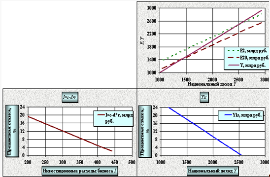 = Графа 2: C2 = a + b*(Y2 - T) = 105+0.76*(2313-150)=1749 Графа 5: E2 = C + I + G = 1749+414+150=2313 Графа 7: S = Y - G – C = 2313-1749-150=414 Рис. 4.1. строится в координатах: ось х – национальный доход Y (графа 6 таблицы 4.1.); ось у – процентная ставка r (графа 1 таблицы 4.1.); Вспомогательными графиками являются: –график инвестиционных расходов, который строится в осях: величина инвестиционных расходов I (ось х) – процентная ставка r (ось у). Например, при I=442, r =2; при I=190, r =20; –крест Кейнса, который строится в осях Y–E. На примере нескольких процентных ставок r из таблицы 4.1. показывается последовательность изменения национального дохода Y под воздействием изменяющихся процентных ставок r (r-I-E-Y). Функция IS состоит из различных комбинаций r и Y, при которых на товарном рынке в экономике возможно равновесие. На кресте Кейнса строим две линии Е (Е1 и Е2 ). Первая точка – точка равновесия: для Е1 (при r = 2) равна 2429 для Е2 (при r = 20) равна 1379 Вторая точка: при r = 2, Y = 0, E = a + b*(Y – T) + I + G = 105-0.76(0-150)+442+150=583 при r = 20, Y = 0, E = a + b*(Y – T) + I + G = 105-0.76*150+190+150=331 Тогда линия Е1 строится по точкам (2429;2429), (0;583); линия Е2 строится по точкам (1379;1379), (0;331). Линия IS будет проходить через точки (1379;20), (2429;2).