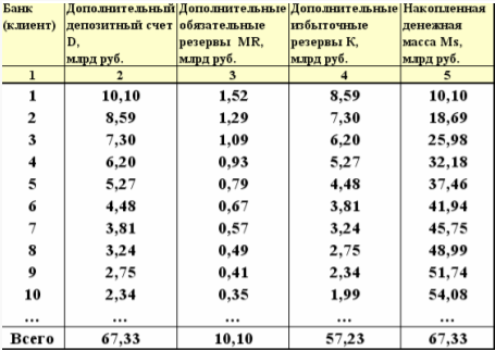 Графа 2 (для первого банка): D1 = H Графа 2: Di = Ki -1 , Графа 3: MRi = Di *R, Графа 4: Ki = Di – MRi , Графа 5: Må i = Må i-1 + Di = Må i-1 + Ki-1 . Строка «Итого»: Графа 5: Må полн = H*m = H/R, Графа 2: в = Må , Графа 3: MR = D*R, Графа 4: K = в – MR. Расчет 2-й строки: Графа 2 (для первого банка): D1 = 10,10 Графа 2: D2 = K1 = 8,59 Графа 3: MR2 = D2 *R = 8,59*0.15=1.29 Графа 4: K2 = D2 – MR2 = 8,59-1.29=7,30 Графа 5: Må i = 10.1 +8,59=18,69 Расчет строки «Итого»: Графа 5: Må полн = 10,10/0,15 = 67,33 Графа 2: в = Må = 67,33 Графа 3: MR = 67,33*0.15=10.1 Графа 4: K = 67,33-10.1=57,23