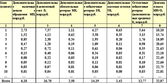 Пример расчёта второй строки: Графа 2: (для первого банка) MH1=H•g=10.1*0.27=2.73 Графа 2: MHi=Ki-1•g=5,64*0.27=1,52 Графа 3: (для первого банка) D1=H-MH1=10,1-2,73=7,37 Графа 3: Di=Ki-1-MHi =5,64-1,52=4.12 Графа 4: MRi=Di•R=4.12*0.15=0.62 Графа 5: DRi=Di-MRi=4.12-0.62=3,50 Графа 6: URi=Di•b=4.12*0.085=0.35 Графа 7: Ki=DRi-URi=3,50-0.35=3.15 Графа 8: MHi+Di=10.1+1.52+4.12=15,74 Итого: (МН +D) ∑ = Н*m=Н*(γ*mk + mD ) = H*(γ*(1-R-β)/(R+β*(1-γ)+γ*(1-R))=22,87; DR∑ = H*((1-R-β)/(R+β*(1-γ)+γ*(1-R))=14,19; D∑ = H/(R+β*(1-γ)+γ*(1-R))=16,70; UR∑ = D∑* β=1,42; MR∑ = D∑* R=2,50; K∑ = D∑ - MR∑ =12,77.