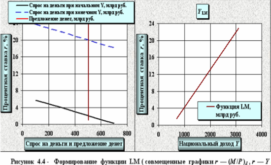 4.4 Формирование параметров равновесия на денежном рынке (функция LM) 4.4.1 Национальный (центральный) банк через систему коммерческих банков создает номинальное предложение денег в размере Ms =1040 млрд. руб. Экономические субъекты («публика») создают спрос на деньги при разном национальном доходе и разных процентных ставках на сумму: (M/P)d = e*Y - f*r, где e - чувствительность спроса на деньги к изменению национального дохода(e=0,96млрд.руб./млрд.руб.); f - чувствительность спроса на деньги к изменению процентной ставки (f = 108 млрд.руб./проц.пункт). Уровень цен в экономике P=2,06. (коэффициент по сравнению с базовым периодом, в котором P=1). Подобрать различные комбинации r и Y, при которых на денежном рынке будет равновесие . Расчет сделать для разных процентных ставок в пределах от 2% до 20% с шагом 2%. Построить график функции LM . Таблица 4.4 - Формирование параметров равновесия на денежном рынке (функция LM)