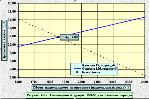 4.5 Формирование параметров совместного равновесия на денежном и товарном рынках (модель IS/IL) 4.5.1 На основе результатов выполнения заданий 1 и 4 рассчитать процентную ставку r и национальный доход Y, при которых экономика будет работать в условиях двойного равновесия (на товарном и денежном рынках). Результаты показать на совмещенном графике IS/LM. Таблица 4.5 - Формирование параметров совместного равновесия на денежном и товарном рынках