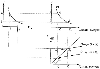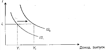 Рис.3. Сдвиги кривой IS Увеличение государственных расходов, снижение налогов обусловят сдвиги кривой IS вправо. Они будут способствовать росту совокупного спроса, а значит, и дохода (выпуска). Соответственно, сокращение госрасходов, повышение налогов приведут к уменьшению совокупного спроса, сдвигу его кривой вниз и снижению равновесного уровня дохода. Кривая IS в таких случаях будет сдвигаться влево. Денежный рынок. Допустим, произведен доход У1 . Его объем определяет спрос на деньги MD1 . Если предложение денег составляет MS, то денежный рынок будет находиться в равновесии в точке Е1 (рис. 4 а). Следовательно, при доходе Y1 денежный рынок будет равновесным при процентной ставке r1 . Значения Y1 , r1 определяют на рис. 4 б точку А. При доходе Y2 спрос на деньги возрастет до MD2, и денежный рынок будет находиться в равновесии, когда ставка процента будет равна r2 . Значения У2 и r2 определяют на графике точку В.