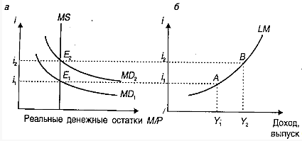 Рис. 5. Сдвиги кривой LM: изменение предложения денег Кривая LM сдвигаться и под влиянием изменений автономного спроса на деньги (изменений, вызванных экзогенными факторами вследствие изменений уровня цен, реального дохода (выпуска) или процентной ставки). Допустим, что рынок денег находится в равновесии в точке Е1 , при равновесной ставке процента r1 (рис. 6 а).