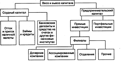 Рис. 2. Деление ввоза и вывоза капитала на ссудный и предпринимательский 1.2 Вывоз прямых и портфельных инвестици й Предпринимательский капитал включает прямые и портфельные инвестиции. Портфельными инвестициями принято называть капиталовложения в акции зарубежных предприятий, которые не дают права контроля над ними, в облигации и другие ценные бумаги иностранного государства и международных валютно-финансовых организаций. Существуют и реальные инвестиции. Это - капитальные вложения в землю, недвижимость, машины и оборудование, запасные части и т.д. Реальные инвестиции включают в себя и затраты оборотного капитала. Характерная черта прямых инвестиций, по определению МВФ, состоит в том, что инвестор участвует в управленческом контроле над объектом (предприятием), в который инвестирован его капитал. Обычно для этого достаточно владеть 10% акционерного капитала. Портфельные инвестиции такого участия в контроле не дают. Они, как правило, представлены пакетами акций (или отдельными акциями), на которые приходится менее 10% собственного капитала фирмы, а также облигациями и другими ценными бумагами. В разных странах формальную границу между прямыми и портфельными инвестициями устанавливают по-разному, но обычно это 10%. Нужно вообще иметь в виду, что граница между прямыми и портфельными инвестициями во многом условна. Часто возможность управленческого контроля может дать весьма небольшой пакет акций (паев) фирмы, особенно если собственный капитал фирмы распределен между многими владельцами или если в руках владельца небольшой части капитала важная для фирмы технология и т.д. Нечеткость границы наблюдается в некоторых случаях и между предпринимательским и ссудным капиталом. Так, к прямым инвестициям относят займы родительских фирм своим зарубежным филиалам. Через вывоз прямых инвестиций инвесторы учреждают за рубежом новую фирму (самостоятельно или с местным партнером); покупают существенную долю в уже действующей за рубежом фирме; полностью покупают (поглощают) эту фирму. За рубежом такие фирмы обычно называют зарубежными филиалами (англ. foreign affiliates) родительских компаний (в России под филиалом часто имеют в виду то, что на Западе именуют отделением). В свою очередь, эти филиалы подразделяются на отделения, дочерние и ассоциированные компании. Отделение (англ. division, branch), которое обычно полностью или на паях принадлежит иностранному инвестору и является его представительством или офисом, хозяйственным товариществом, землей и другой недвижимостью, оборудованием и транспортными средствами. Обычно это закупочно-сбытовые фирмы со складами и сервисным оборудованием, строительные, транспортные и добывающие предприятия. Дочерняя компания (англ. subsidiary) регистрируется за рубежом как самостоятельная компания (т.е. является юридическим лицом) с собственным балансом, но контроль над ней осуществляет родительская фирма, в силу того что она обладает основной частью акций (паев) дочерней компании или же всем ее капиталом. Ассоциированная компания (англ. assotiated company, associate) отличается от дочерней тем, что находится не под контролем, а под влиянием родительской фирмы за счет того, что той принадлежит существенная (но не основная) часть акций (паев). В России отделениям, дочерним и ассоциированным компаниям соответствуют филиал, дочерне