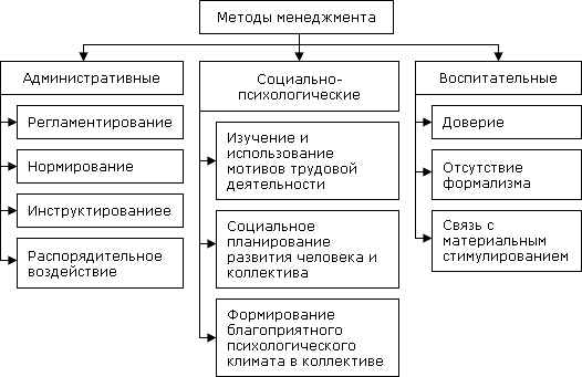 I .1 Роль методов менеджмента на предприятииГлавной целью деятельности организации является получение прибыли. Но эффективная работа невозможна, если она не структурирована и не регулируется принципами ведения управленческой деятельности, в соответствии с которыми разрабатываются методы достижения целей.Методы управления подразделяются на следующие группы: 1. Организационно-правовые методы определяют основные границы работы: направление деятельности фирмы, ее организационно-правовую форму, условия функционирования, структуру организации, а также регламентируют права и ответственность персонала и многое другое.2. Административные методы управления предполагают, что вся деятельность организации основывается на жестком подчинении работников и на их беспрекословном выполнении указаний, зачастую основанном на принуждении. Данная группа методов применяется, если велик вес традиций, в соответствии с которыми может быть принято только однозначное решение, если слишком узок выбор возможных альтернатив или если подавляется инициатива подчиненных.Отличительной чертой данного метода является поощрение исполнительности, а не инициативности. Как следствие, эффективность этой группы методов значительно ограничивается, так как не учитывает и не использует всех возможностей организации.3. Экономические методы основаны на материальной заинтересованности работников и позволяют активизировать их деятельность. Данная группа методов в совокупности с административными может привести к высоким результатам. Это связано с тем, что наряду с дисциплинированностью и ответственностью за принимаемые решения на предприятии стимулируется инициативность работников, и, как следствие, повышается эффективность организации. В результате предприятие получает дополнительную прибыль за счет снижения издержек, из которой выплачиваются премии участникам работ или всем сотрудникам. Для большей заинтересованности работников денежные выплаты (заработная плата, премии) привязываются к прибыли или достигнутым результатам. Социально-экономические методы являются более эффективными, чем административные и экономические, что может быть связано с тем, что материальное вознаграждение удовлетворяет основные потребности работника и у него возникают потребности более высокого порядка (по теории мотивации Маслоу). Кроме того, применение данной группы методов может не оказывать весомого влияния на творческих личностей, занятых интеллектуальным трудом. Они были сформулированы в 20-е гг. XX в.5. Социально-психологические методы подразделяются на два вида воздействия: 1. создание благоприятного морально-психологического климата в коллективе и уважительных (доверительных) отношений между руководителем и подчиненными; 2. предоставление возможности развития и реализации личных способностей работников, что в результате приведет к повышению удовлетворенности и, как следствие, эффективности работы сотрудников и предприятия в целом. I .2 Принципы выбора методов менеджментаМетоды менеджмента - способы осуществления целенаправленного воздействия на производственный коллектив или отдельного работника. Они отличаются друг от друга мотивационной характеристикой , т.е. тем, на активацию каких мотивов поведения людей они ориентированы. Все методы 