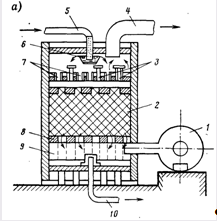 Рис. 19.8. Установки дегазации воды под вакуумом без подогрева ( и с подогревом (б) 1,5 — подача исходной и отвод дегазированной воды; 2 — воздухоотделитель; 3 — котел; 4 — вакуум-насос; 6 — насос; 7 — подача пара; 8 — теплообменник; 9 — сборный бак Для глубокого или частичного удаления оксида углерода (IV) (независимо от его начальной концентрации и производительности установки) и свободного сероводорода применяют дегазаторы с насадкой из колец Рашига и противотоком воды и воздуха. Для удаления оксида углерода (IV) при производительности установки до 150 м3/ч и начальном его содержании не более 150 мг/л используют дегазаторы с деревянной хордовой насадкой или дегазаторы пенного типа. При глубоком удалении оксида углерода (IV) и производительности до 20 м3 /ч применяют барботажные дегазаторы. В случае частичного удаления оксида углерода(IV) при производительности установки до 50 м3 /ч используют струйно- пленочные (контактные) градирни, а для глубокого или частичного обескислороживания воды — вакуумные установки с насадкой из колец Рашига с подогревом или без него. При проектировании дегазаторов должны быть определены: площадь поперечного сечения дегазатора; необходимый расход воздуха и поверхность насадки для достижения требуемой степени дегазации. Площадь поперечного сечения дегазаторов вычисляют по допускаемой плотности орошения насадки, т. е. по расходу воды, приходящемуся на 1 м2 площади поперечного сечения дегазатора. По А. А. Кастальскому, допустимые плотности орошения насадок и удельные расходы воздуха составляют: при глубоком удалении из воды оксида углерода (IV) — до 2... 3 мг/л; на дегазаторах, загруженных кольцами Рашига (25X25X3 мм), — 60 м3/(м2 *ч) и 15 м3 /м3 ; на дегазаторах с деревянной насадкой — соответственно 40 м3/(м2 *ч) и 20 м3 /м3 ; при глубоком удалении из воды сероводорода на дегазаторах загруженных кольцами Рашига, — 40 м3 /(м2 *ч) и 20 м3 /м3 ; при обескислороживании воды на вакуумных дегазаторах плотность орошения насадки равна 50 м3/(м2-ч). Остаточное содержание оксида углерода(IV) после вентиляторной градирни при температуре 5...8°С можно принимать 3...5 мг/л, после контактной градирни — 5... 8 мг/л. Полное обескислороживание воды может быть достигнуто методом, предложенным П. А. Акользиным. Сущность его заключается в том, что эжектор, подающий воду, из которой необходимо удалить кислород, подсасывает предварительно обескислороженный воздух. Под влиянием разности концентрации растворенный в воде кислород переходит из жидкой фазы в газообразную. Газ отделяется от воды в специальном десорбере и затем в сепараторе. Обескислороживание воздуха происходит в герметичном реакторе, загруженном древесным углем и омываемом топочными газами с температурой 500... 800 °С. Однако применение этого метода ограничивается тем, что для обескислороживания воздуха, подсасываемого эжектором, необходимы топочные газы высокой температуры, т. е. наличие котельной. Кроме того, в дегазаторе не удается одновременно с обескислороживанием воды обеспечить необходимую степень удаления оксида углерода (IV). Метод удаления сероводорода аэрированием представляет собой комбинирование аэрирования с биохимическим окислением сероводорода серобактериями. Аэратор содержит шлаковую загрузку. Интенсивность орошения при концентрации сероводорода 40...42 г/м3 составляет 3...4 м3/(м2-ч), расх