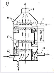 Рис. 19.2. Пленочный (а), вакуумный (б) и пенный (в) дегазатор:1 — вентилятор; 2 — насадка из керамических колец Рашига; 3 — газоотводной патрубок; 5, 10 — ввод исходной и отвод дегазированной воды; 7— оросительные патрубки; 4 — удаление воздуха; 9 — поддон; 8 — дырчатое днище; 6 — водораспределительная воронка; 11 — люк; 12 — патрубки для водомерного стекла; 13 — ввод воздуха; 14 — пенный слой