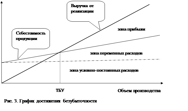 В современных условиях, прежде чем начать производство какой-то продукции, экономисты предприятия изучают условия достижения безубыточности путем построения графика достижения безубыточности (рис. 3). При этом все расходы предприятия условно подразделяются на две группы: условно-постоянные (практически не зависят от объемов производимой продукции и связаны с созданием и функционированием предприятия как хозяйствующего субъекта) и переменные (прямые расходы на производство каждой единицы продукции).