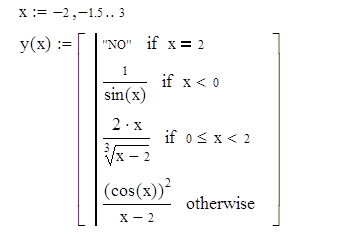 В Pascal: program z2; uses crt; label 20; var x,y,Xn,Xk,h:real; begin clrscr; writeln('Please ENTER Xn,Xk,h='); readln(Xn,Xk,h); x:=Xn; while x<=Xk+h/2 do begin if x<0 then y:=1/sin(x) else if (x>=0) and (x<2) then y:=(2*x)/((abs(x-2)/(x-2))*(exp(1/3*(ln(abs(x-2)))))) else if x>2 then y:=sqr(cos(x))/(x-2) else begin writeln('NO answer'); goto 20; end; writeln('x=',x:3:1,' y=',y:6:3); 20: x:=x+h; end; readkey; end. Результаты вычислений: