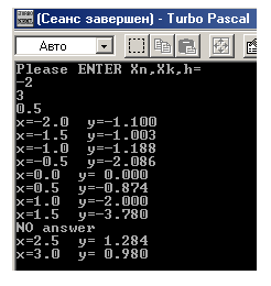 В Pascal: program z1; uses crt; var Xn,Xk,X,Y,H,Z:REAL; begin clrscr; write('‚Enter Xn,Xk,H='); readln(Xn,Xk,H); X:=Xn; repeat z:= 1-exp((0.5)*x); if z=0 then writeln('NO') else Y:=ln(6.8*sqrt(x))*(exp((1/3)*(ln(abs(Z))))*(abs(Z)/Z)); writeln('X=',X:6:1,' Y=',Y:8:3); X:=X+H; until X>=Xk+H/2; readkey; end. Результаты вычислений: